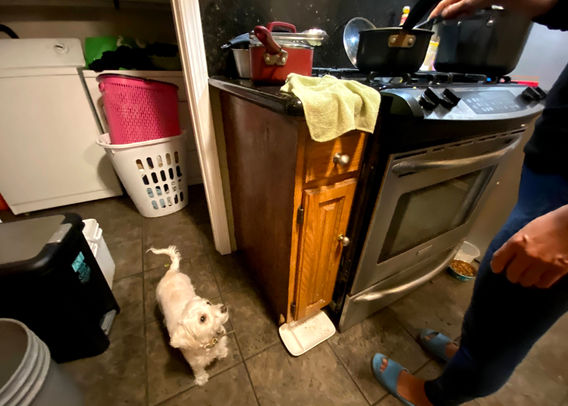 I chose this wide shot as the transition of the story. It's showing my mom is cooking in the kitchen and my dog realized the food when she was passing by.
